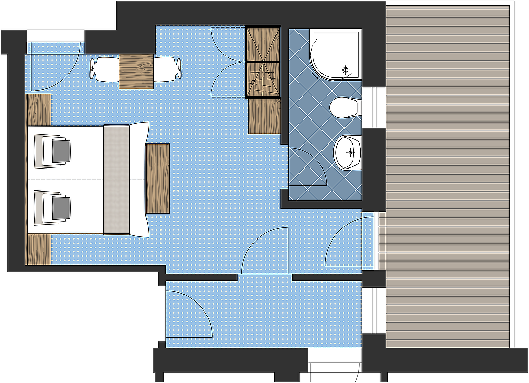 Sedie a sdraio, doccia e toilette, asciugacapelli, specchio per il trucco, TV satellitare, telefono, cassaforte,W-LAN. Fino a 4 persone.